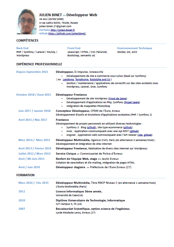 J'ai acquis une certaine expertise avec les technologies php, javascript, html/css et les outils/frameworks Symfony, Wordpress.
